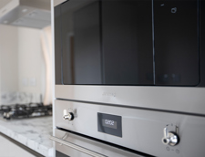- 60cm Classic stainless steel gas hob, multifunction oven, 60cm chimney hood, integrated built-under fridge and freezer, microwave oven and pizza stone